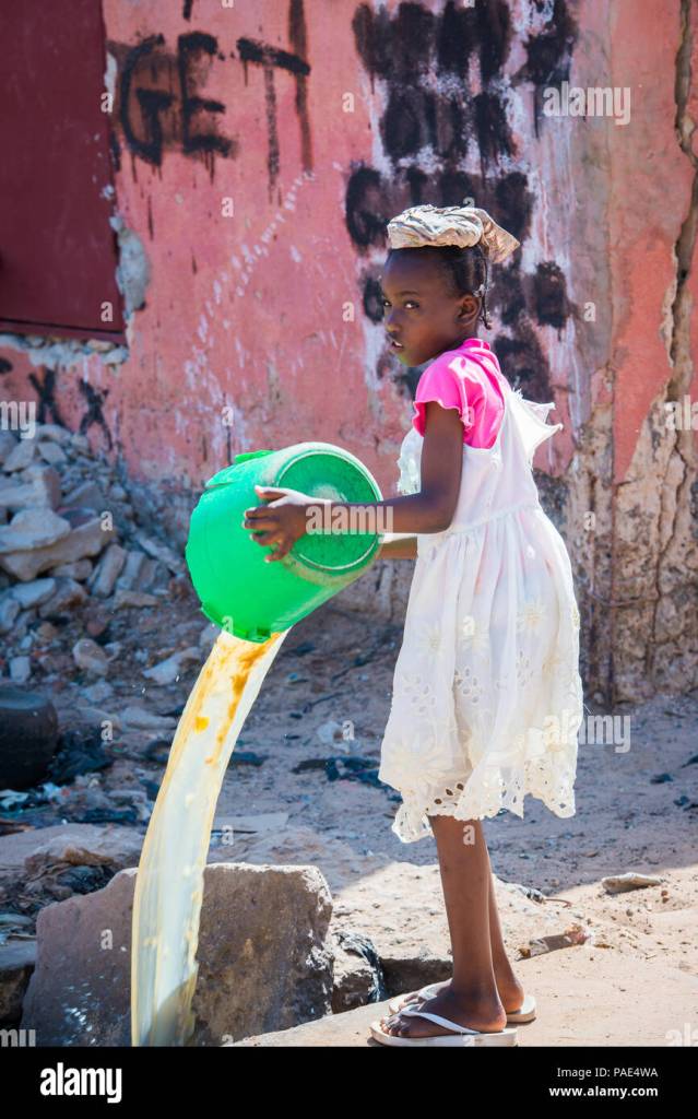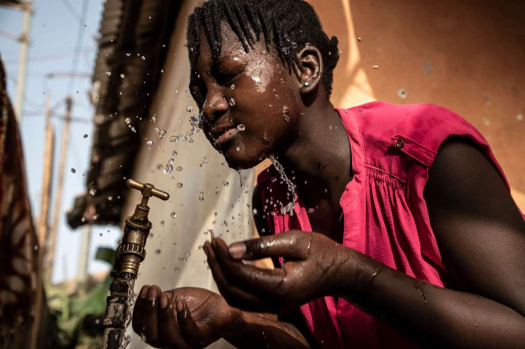 14 year old Ya Nima Jaiteh washes her face at a tap in her family’s compound in the densely populated village of Bakau, The Gambia where nitrate has been found in the water supply by PURA inspectors. Nitrate can occur due to contamination into boreholes from soakaways / pit latrines being, and from fertilizers.